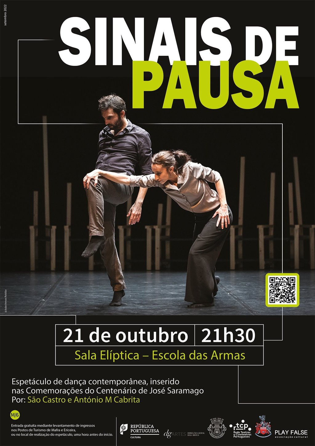 A Câmara Municipal promove o espetáculo de dança contemporânea “Sinais de Pausa”, no próximo dia 21 de outubro, às 21h30, na Sala Elíptica do Palácio Nacional de Mafra (Escola das Armas).