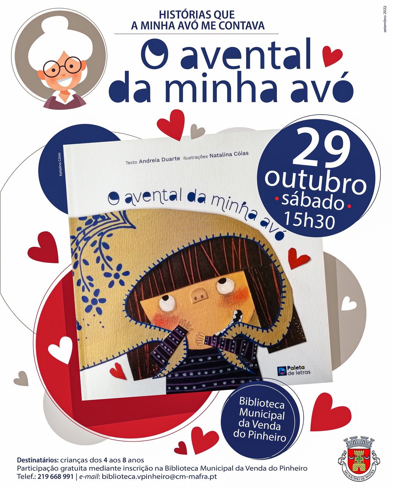 “O avental da minha avó”, de Andreia Duarte, é a história que as crianças dos 4 aos 8 anos poderão escutar na próxima atividade da Hora do Conto, no dia 29 de outubro, às 15h30, na Biblioteca Municipal da Venda do Pinheiro.