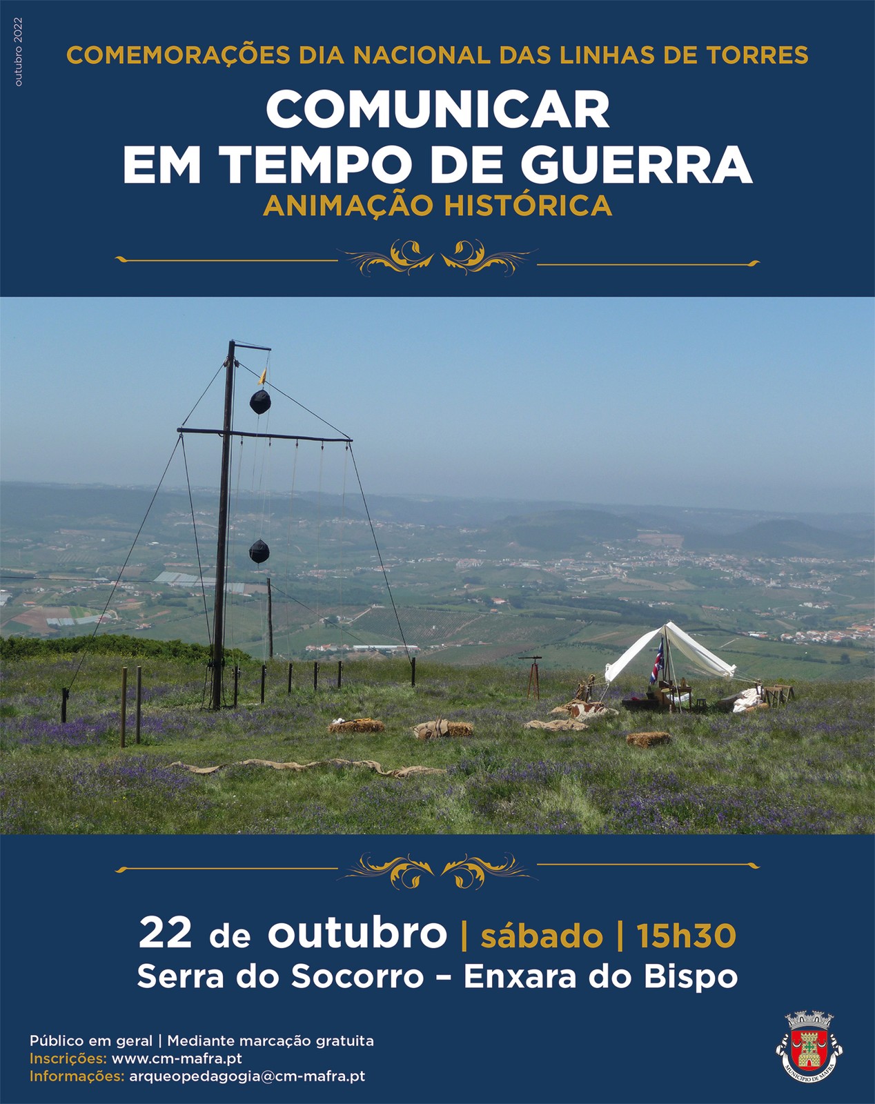 Assinalando o Dia Nacional das Linhas de Torres, a Câmara Municipal dinamiza a atividade “Comunicar em tempo de Guerra”, no dia 22 de outubro, pelas 15h30, na Serra do Socorro. Esta é uma animação histórica que permitirá ao público aprender como se manobrava o telégrafo de balões no período das Invasões Francesas, simulando o envio de mensagens codificadas.