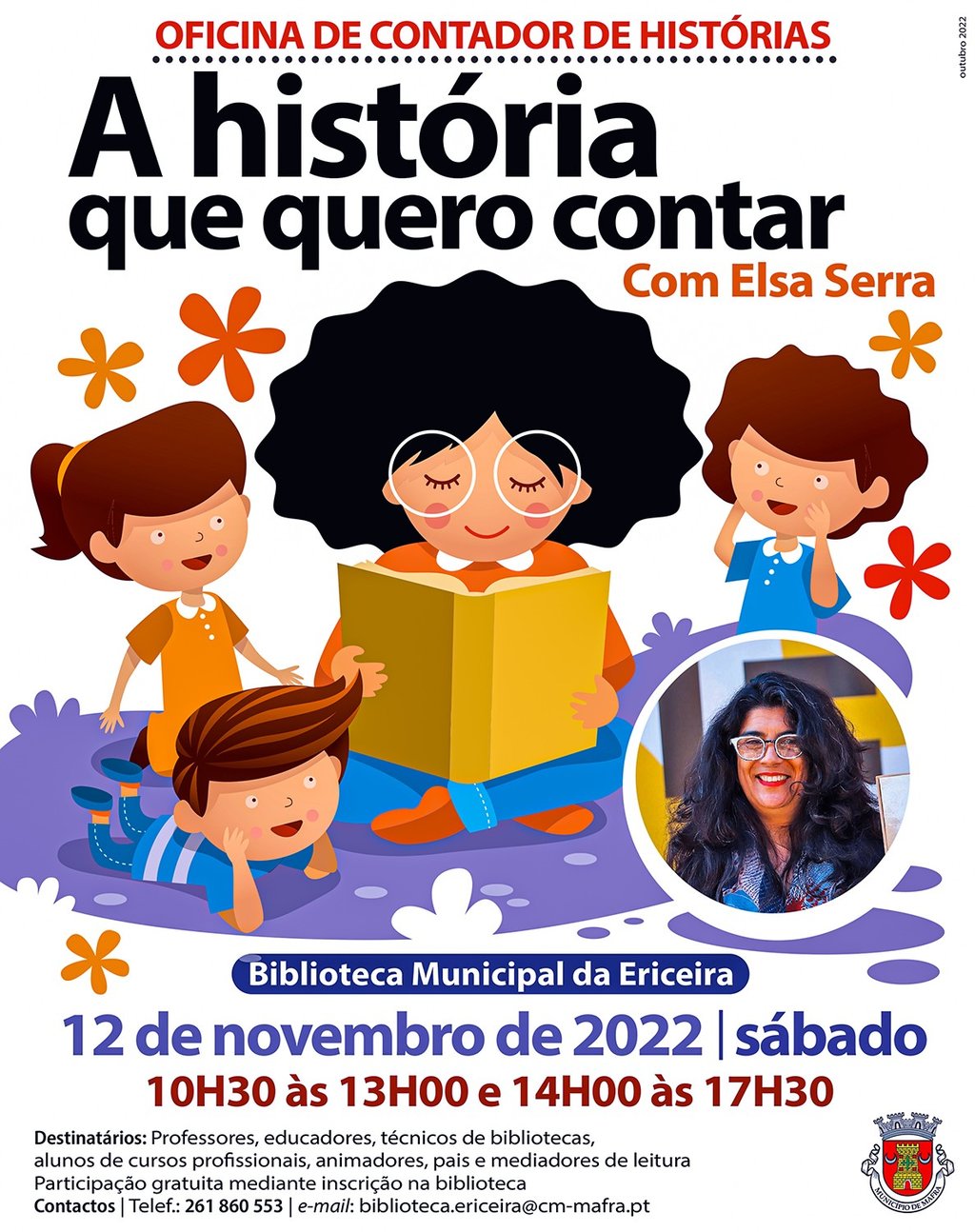 A Biblioteca Municipal da Ericeira acolhe a oficina de contador de histórias “A história que quero contar”, dinamizada por Elsa Serra, no dia 12 de novembro, das 10h30 às 13h00 e das 14h00 às 17h30.