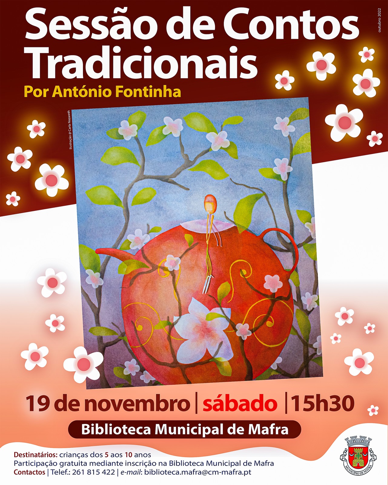 O conto popular e as tradições vão estar em destaque no dia 19 de novembro, às 15h30, na Biblioteca Municipal de Mafra, com o contador de histórias António Fontinha. A sessão, direcionada a crianças dos 5 aos 10 anos, contará com os melhores contos tradicionais que marcaram a cultura portuguesa.