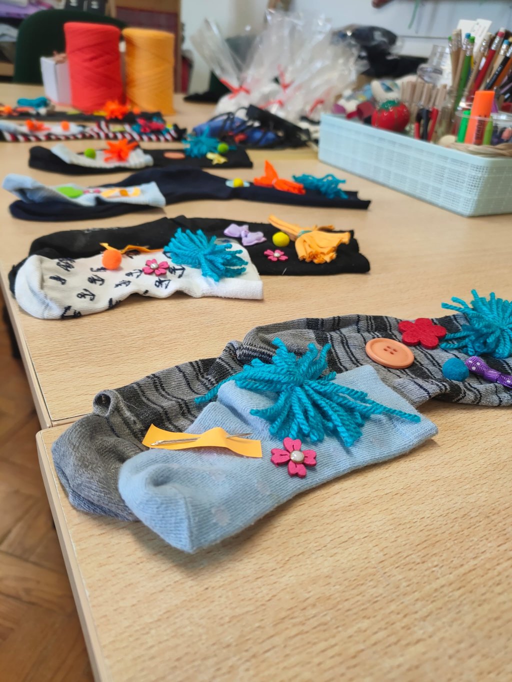 Durante a atividade foram criadas peças de vestuário infantil e brinquedos, a partir da reutilização de resíduos têxteis, como restos de linhas e novelos de lã, e do recurso a máquinas de costura antigas.