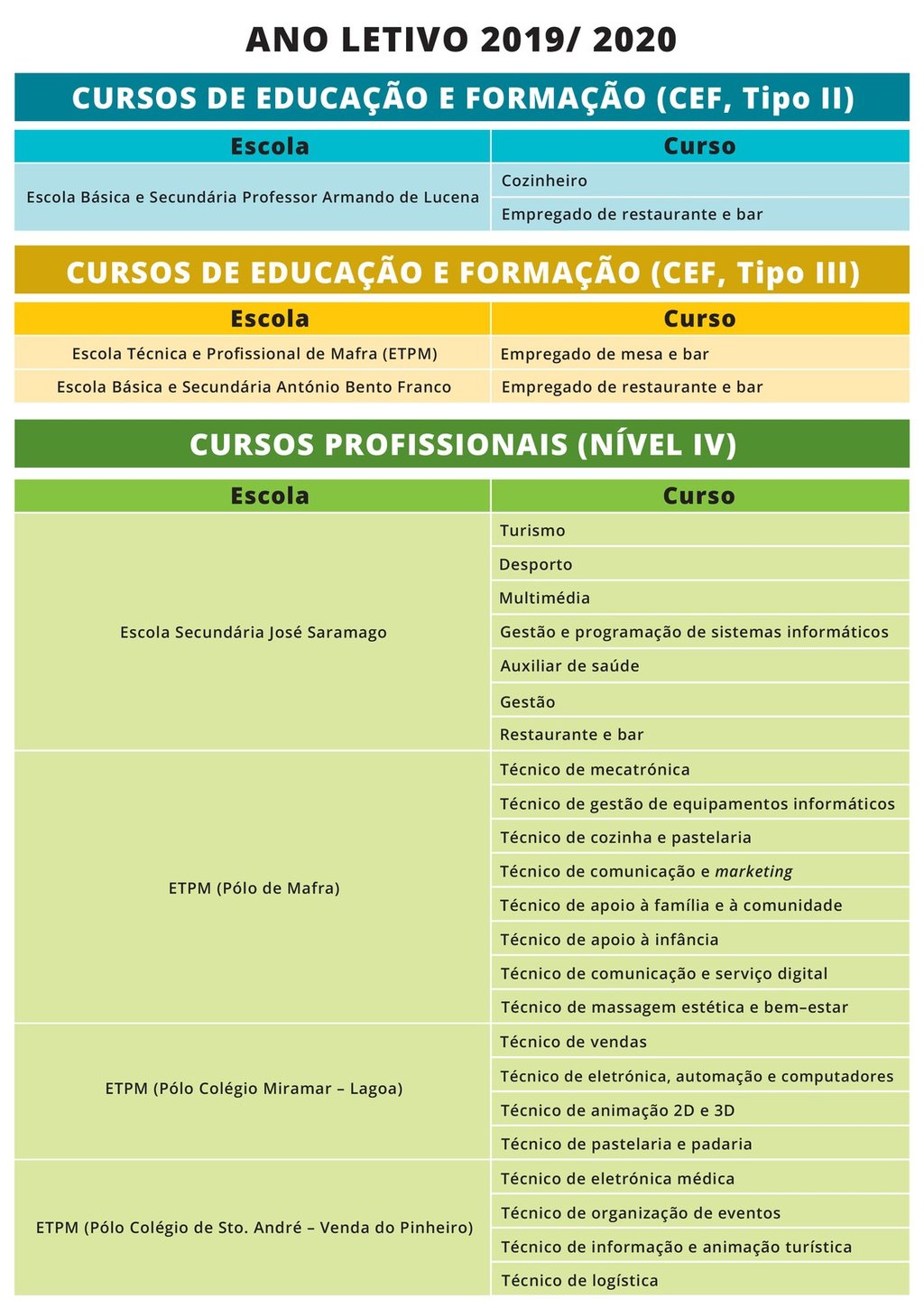 O ano letivo de 2019/ 2020 ficará marcado pela entrada em funcionamento de novos cursos de ensino profissional, no Concelho de Mafra. Ao alargamento da oferta corresponde, igualmente, a sua descentralização, sendo disponibilizada na Ericeira, Lagoa, Mafra, Malveira e Venda do Pinheiro.