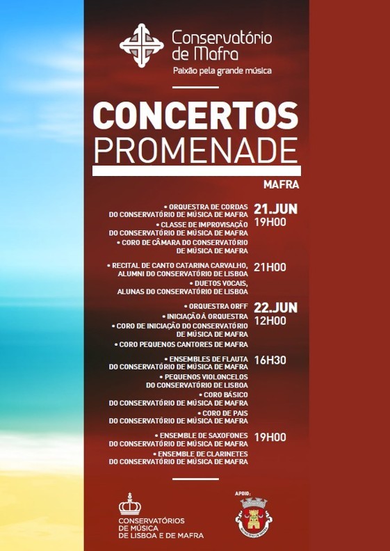 O Conservatório de Música de Mafra assinala o encerramento do ano letivo com dois dias de momentos musicais, abertos à população: 21 de junho, 6.ª feira, a partir das 19 horas, na Casa da Música Francisco Alves Gato, em Mafra, e partir das 21 horas, no Auditório Municipal Beatriz Costa, em Mafra; e 22 de junho, sábado, a partir das 12 horas, na Casa da Música Francisco Alves Gato, em Mafra.