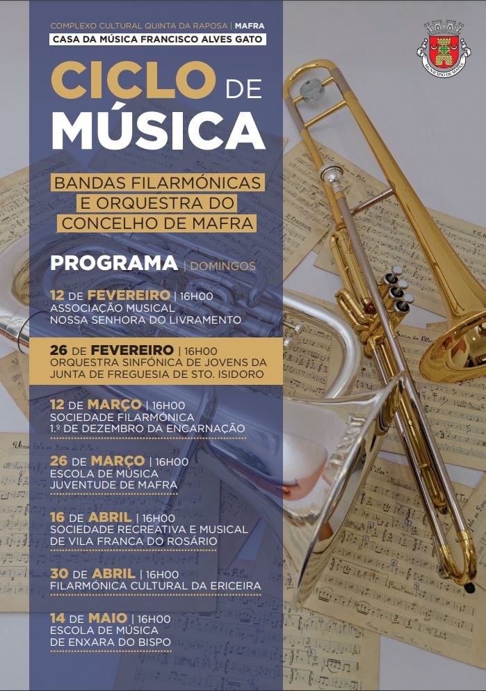 O segundo concerto do Ciclo de Música “Bandas Filarmónicas e Orquestra do Concelho de Mafra” realiza-se já no próximo dia 26 de fevereiro, pelas 16h00, na Casa da Música Francisco Alves Gato, em Mafra. Neste espetáculo, sobe ao palco a Orquestra Sinfónica de Jovens da Junta de Freguesia de Santo Isidoro, sob a direção do maestro Fausto Santos.
