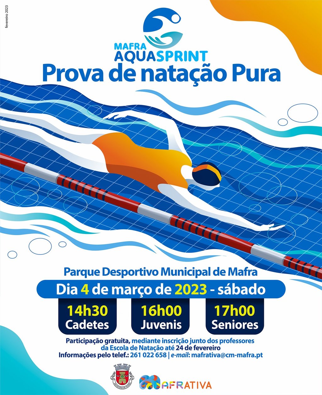 Fomentando a aprendizagem em contexto de competição, a Câmara Municipal dinamiza mais uma edição do “Mafra Aqua Sprint”, a prova de natação pura, destinada aos alunos da Escola de Natação das Piscinas Municipais. A atividade realiza-se no Parque Desportivo Municipal de Mafra, no próximo dia 4 de março, a partir das 14h30, dividindo-se em três escalões: cadetes, juvenis e seniores.