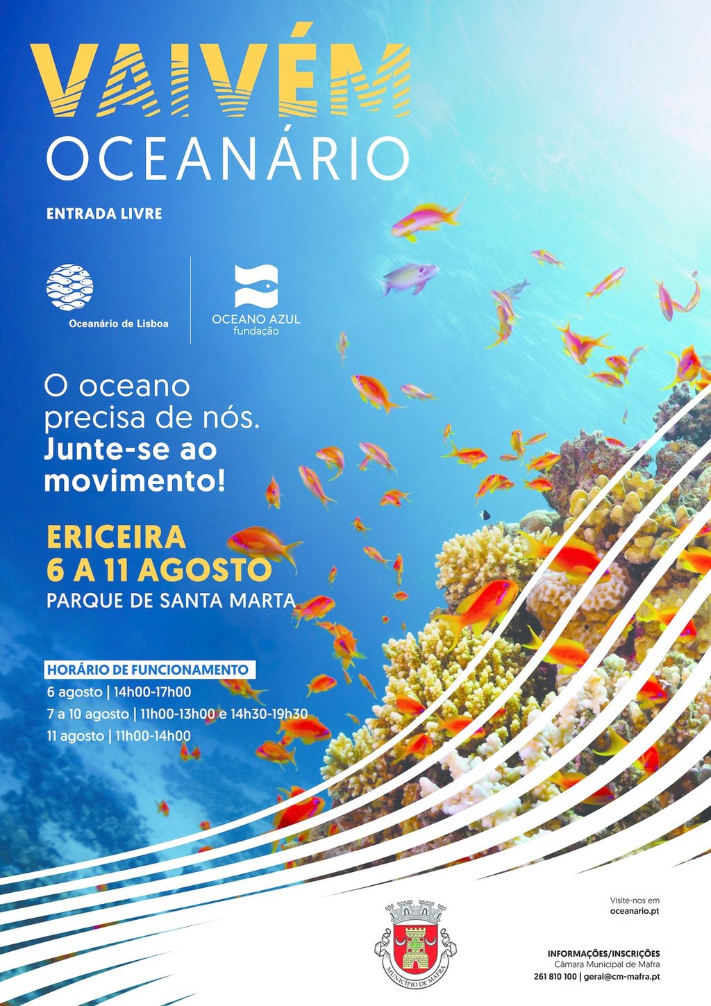 De 6 a 11 de agosto, o "Vaivém Oceanário" estará presente na Ericeira, no Parque de Santa Marta. Sob o mote “Proteção ativa do Oceano”, esta iniciativa é um convite a compreender como o oceano nos influencia, o nosso impacto no oceano e qual o nosso papel na sua conservação. Participe, gratuitamente, nesta viagem, dia 6 de agosto, das 14h00 às 17h00, de 7 a 10 de agosto, das 11h00 às 13h00 e das 14h30 às 19h30, e no dia 11 de agosto, das 11h00 às 14h00.