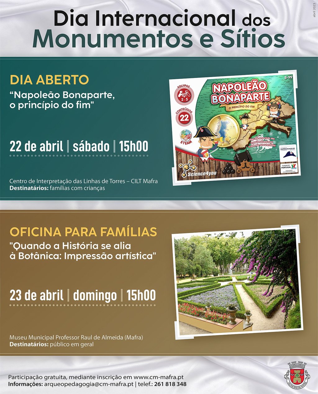 Para assinalar o Dia Internacional dos Monumentos e Sítios, a Câmara Municipal organiza um conjunto de atividades lúdicas e pedagógicas, direcionadas às famílias do Concelho, nos dias 22 e 23 de abril. Conheça a programação.