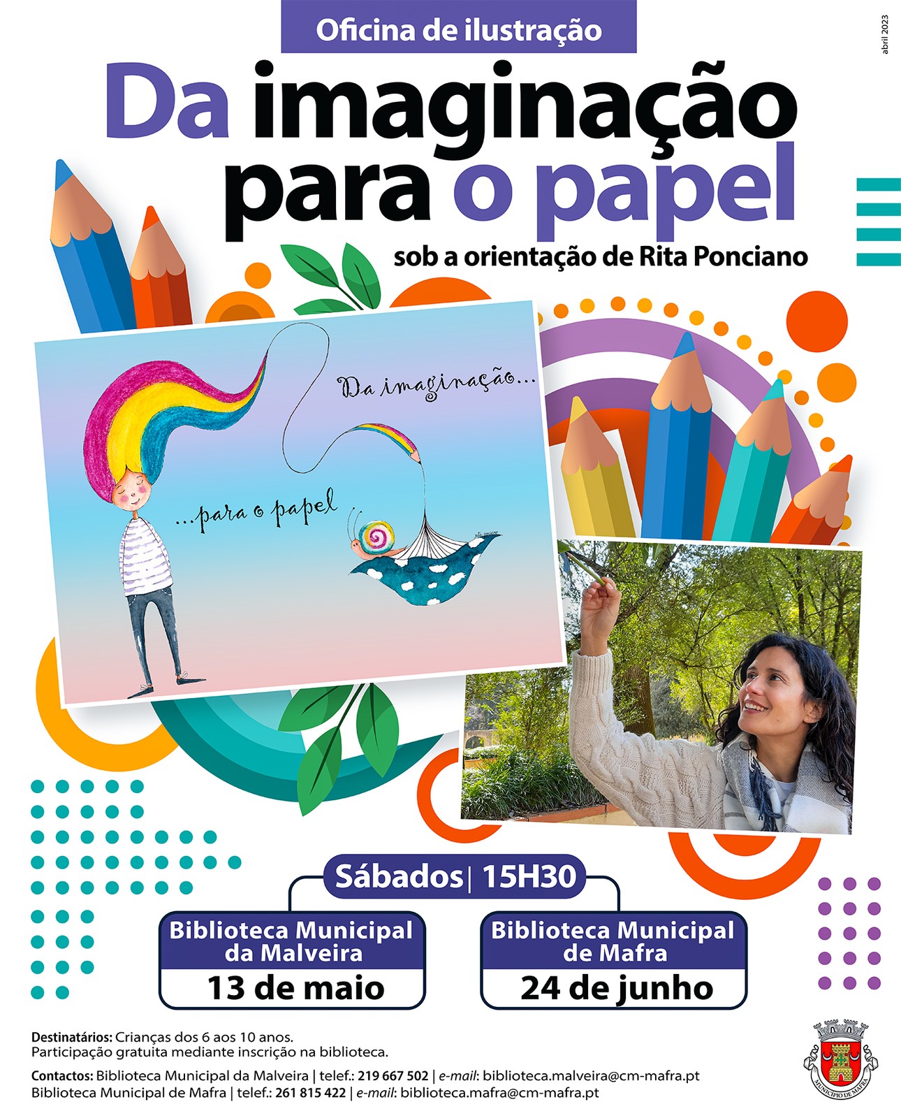 “Da imaginação para o papel” é a oficina de ilustração que a artista Rita Ponciano irá apresentar na Biblioteca Municipal da Malveira, no dia 13 de maio, e na Biblioteca Municipal de Mafra, no dia 24 de junho. As sessões realizam-se às 15h30.