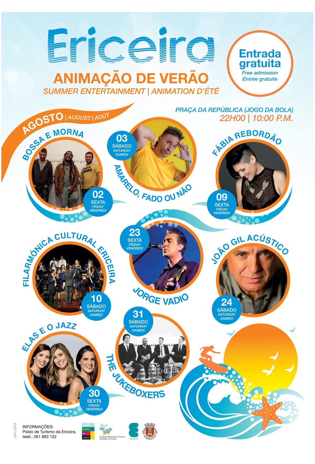 A 2 de agosto atuam “Bossa e Morna”, no dia 3 “Amarelo, Fado ou Não”. No dia 9 realiza-se o concerto com Fábia Rebordão e no dia 10 com a Filarmónica Cultural Ericeira. No dia 23 sobe ao palco Jorge Vadio, e no dia 24, João Gil. A 30 de agosto atuam Elas e o Jazz (composto por Joana Machado, Marta Hugon, Mariana Norton). O concerto de encerramento, a cargo dos Jukeboxers, realiza-se a 31 de agosto.