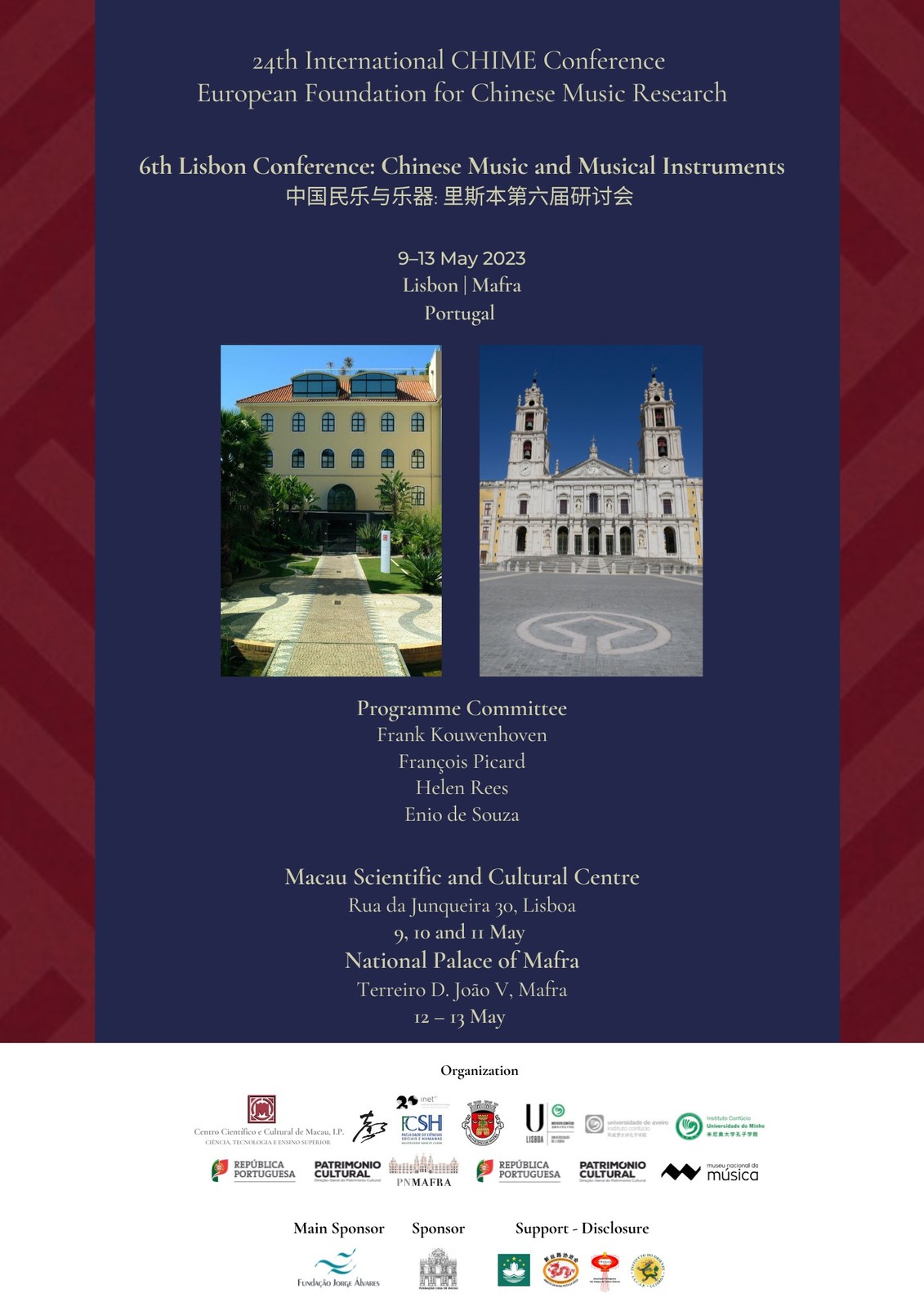O Centro Científico e Cultural de Macau em Lisboa (CCCM), a European Foundation for Chinese Music Research (CHIME) e a Câmara Municipal de Mafra organizam a 24th International CHIME Lisbon Conference, de 9 a 11 de maio, a decorrer nas instalações do CCCM, e a 6th Lisbon Conference: Chinese Music and Musical Instruments, no Palácio Nacional de Mafra, nos dias 12 e 13 de maio.
