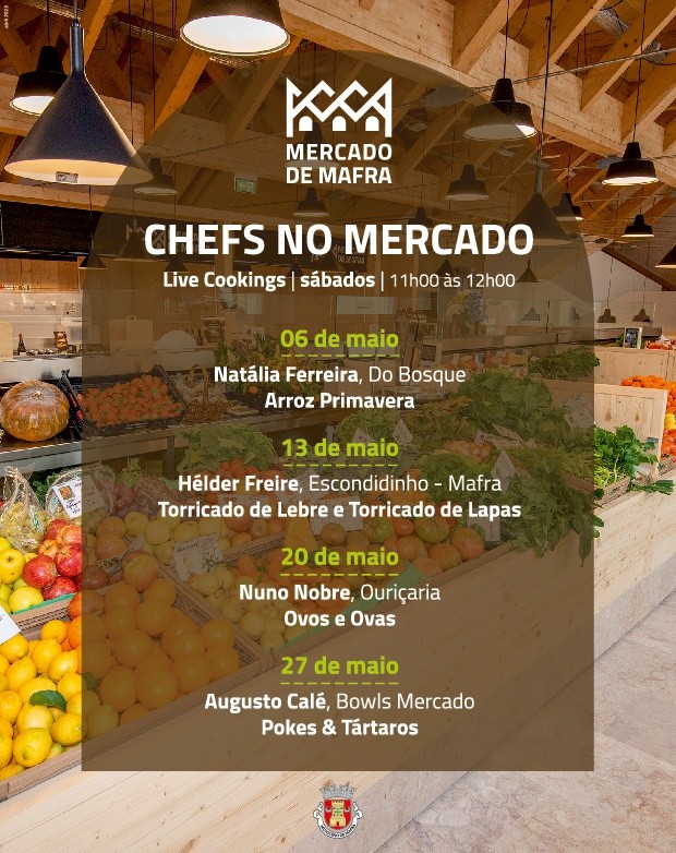 No próximo sábado, dia 20 de maio, o Mercado Municipal de Mafra volta a receber o programa gastronómico “Chefs no Mercado”. Entre as 11h00 e as 12h00, não perca a sessão de live cooking de Ovos e Ovas, com o chef Nuno Nobre (Ouriçaria).