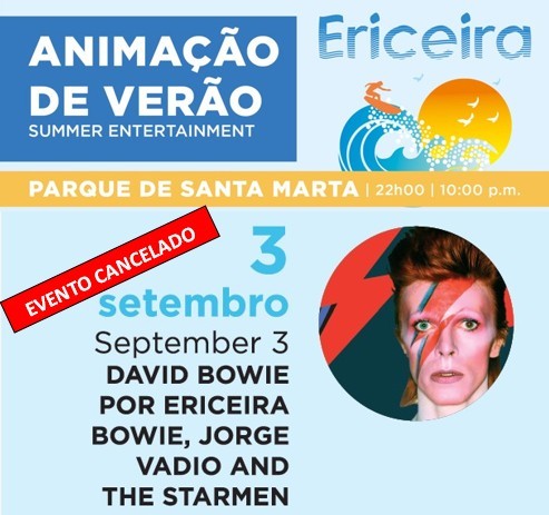 Informa-se que, devido às condições meteorológicas adversas, é cancelado o concerto de tributo a David Bowie, por Ericeira Bowie, Jorge Vadio and The Starmen, integrado na Animação de Verão na Ericeira e agendado para hoje, domingo, dia 3 de setembro, às 22 horas, no Parque de Santa Marta, na Ericeira.