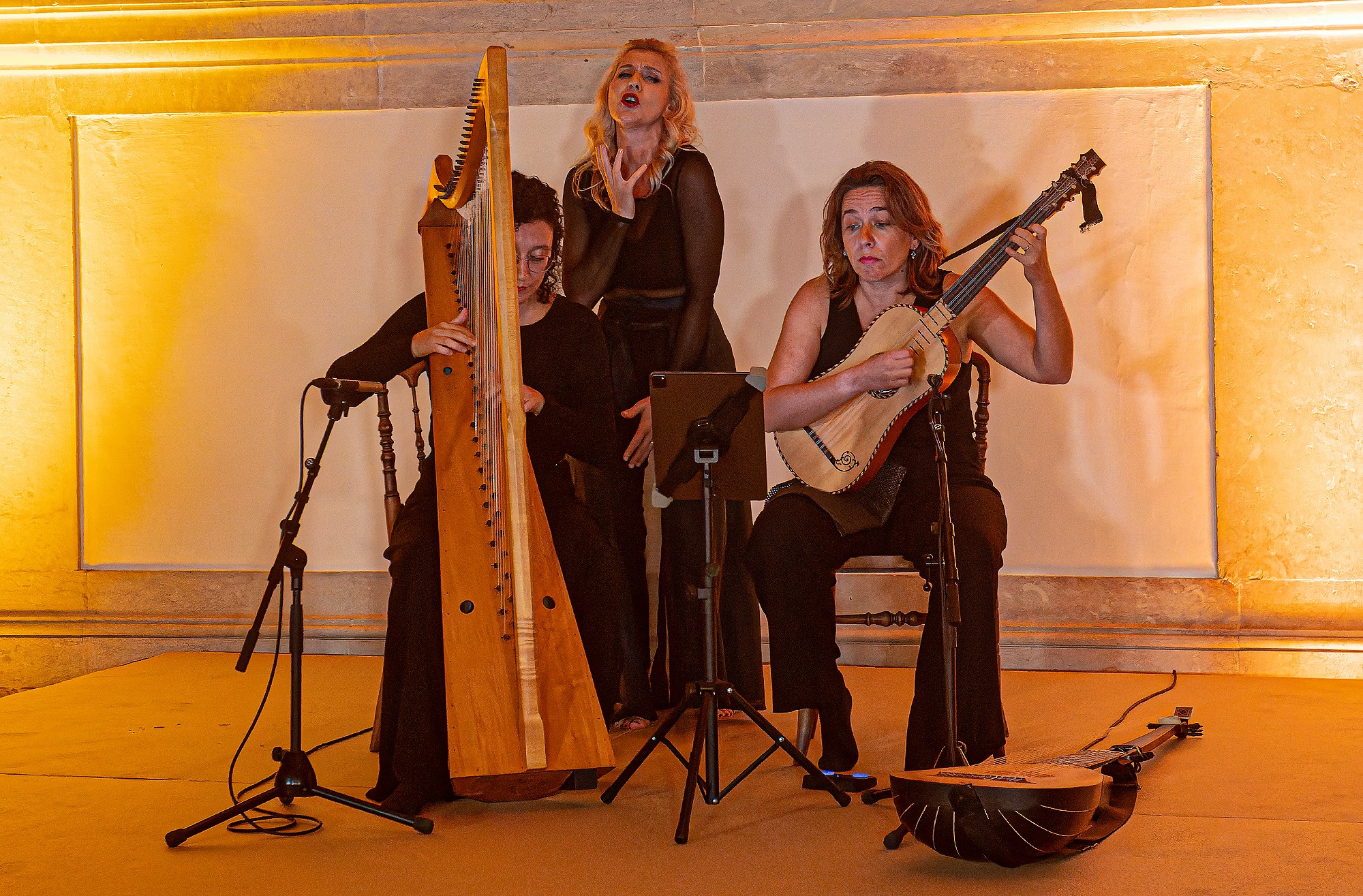 Patrycja Gabrel (soprano), Yola Pinto (bailarina), Ana Castanhito (harpa) e Helena Raposo (guitarra barroca e teorba) foram as protagonistas da sessão, realizada ontem, na Sala Elíptica do Real Edifício de Mafra.