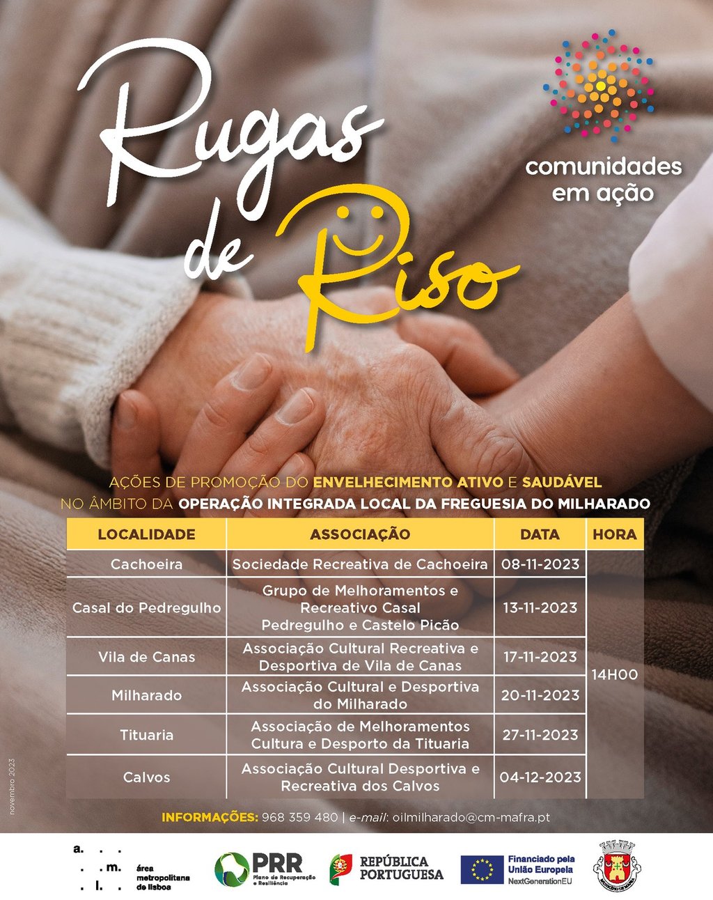 Até ao dia 4 de dezembro, o projeto “Rugas de Riso” estará a percorrer a Freguesia do Milharado com sessões de música, com vista à promoção de um envelhecimento ativo e saudável. As ações realizam-se sempre às 14h00. A próxima sessão está marcada para o dia 17 de novembro, na Associação Cultural, Recreativa e Desportiva de Vila de Canas.