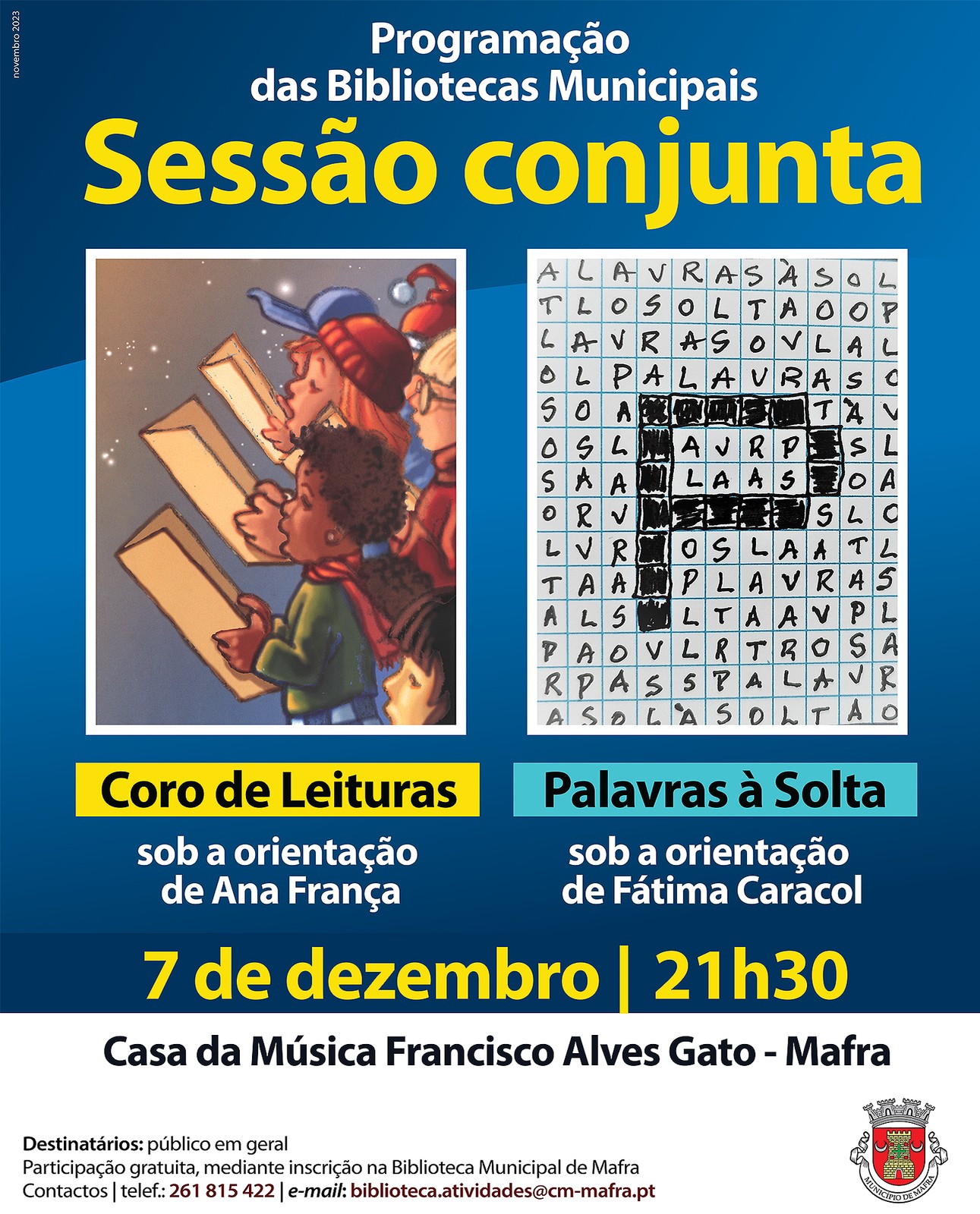 As oficinas temáticas “Coro de Leituras”, de Ana França, e “Palavras à Solta”, de Fátima Caracol, unem-se numa noite onde a poesia e tons de voz vão estar em destaque. Esta, que é uma sessão especialmente dedicada à leitura, está marcada para o dia 7 de dezembro, às 21h30, na Casa da Música Francisco Alves Gato, em Mafra.