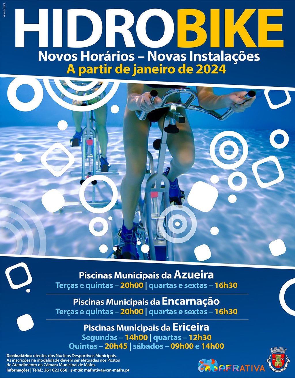 A partir de janeiro de 2024, as Piscinas Municipais da Azueira, Encarnação e Ericeira disponibilizam, também, aulas de Hidrobike. Conheça os novos horários.