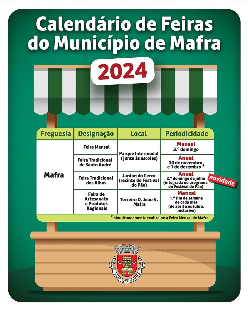 A Câmara Municipal divulga o calendário de feiras para 2024, trazendo uma novidade. No próximo ano, a Feira Tradicional dos Alhos integra o programa do Festival do Pão, passando a realizar-se no 2.º domingo do mês de julho, no recinto do certame (Jardim do Cerco, em Mafra).