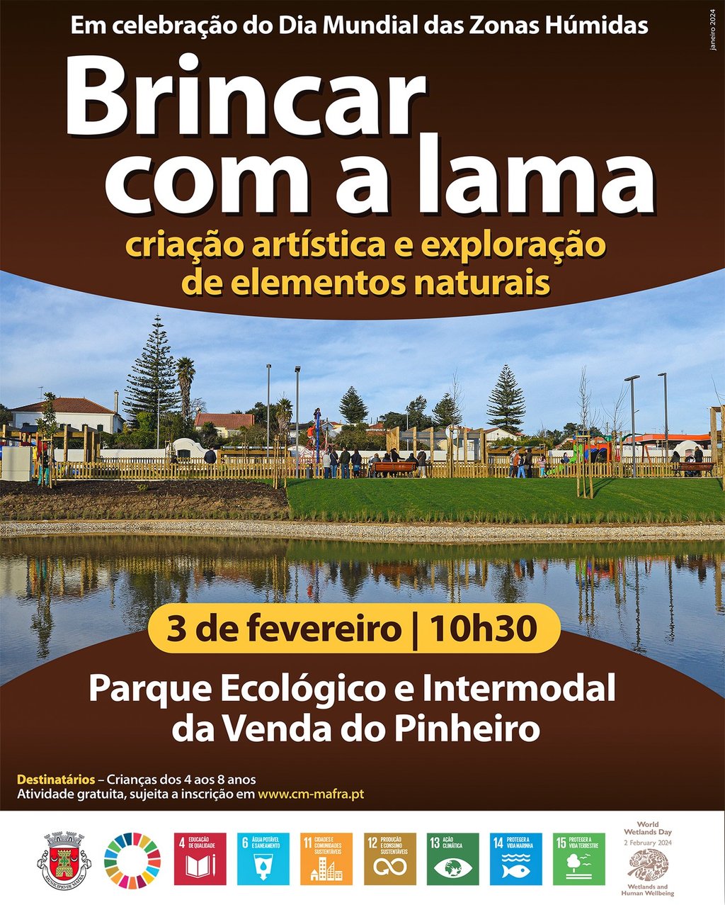 Em celebração do Dia Mundial das Zonas Húmidas, o Município de Mafra organiza, no dia 3 de fevereiro, das 10h30 às 12h00, o workshop “Brincar com a Lama”, no Parque Ecológico e Intermodal da Venda do Pinheiro. A atividade destina-se a crianças dos 4 aos 8 anos.
