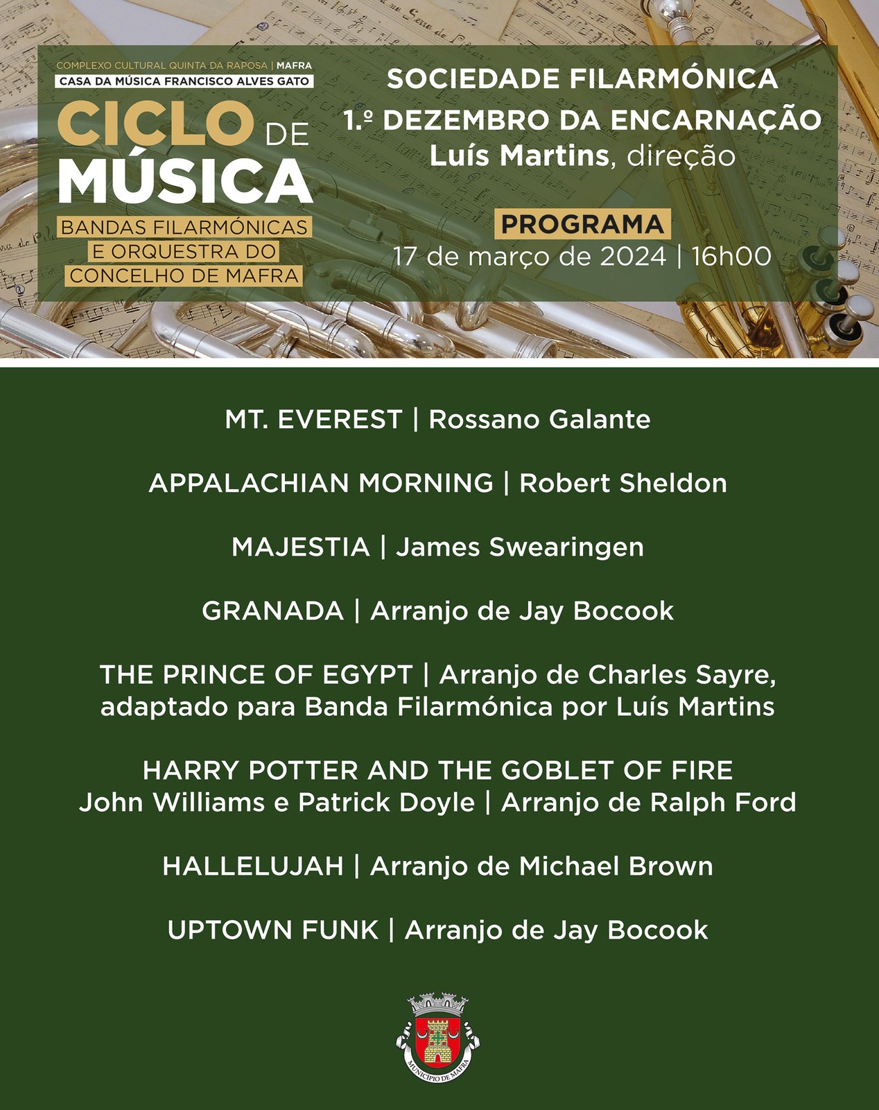 O Ciclo de Música “Bandas Filarmónicas e Orquestra do Concelho de Mafra” continua. A Sociedade Filarmónica 1.º de Dezembro da Encarnação, sob a direção do maestro Luís Martins, sobe ao palco da Casa da Música Francisco Alves Gato, em Mafra, no próximo dia 17 de março, às 16h00.