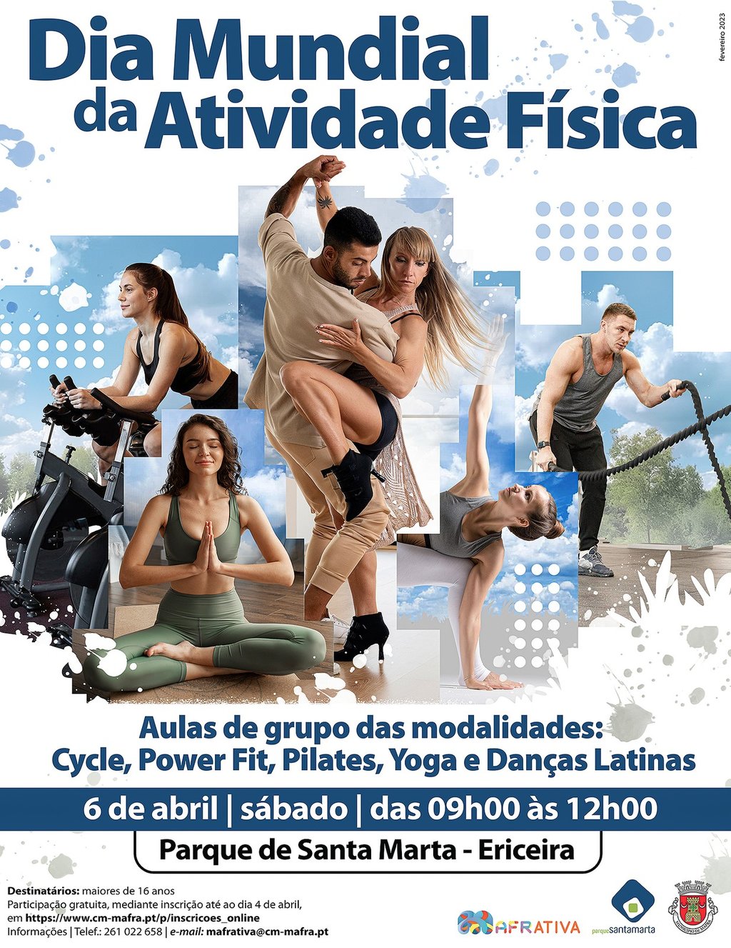 Cycle, power fit, pilates, yoga e danças latinas são as modalidades que poderá experimentar, gratuitamente, no dia 6 de abril, entre as 09h00 e as 12h00, no Parque de Santa Marta, na Ericeira. Venha celebrar o Dia Mundial da Atividade Física connosco!