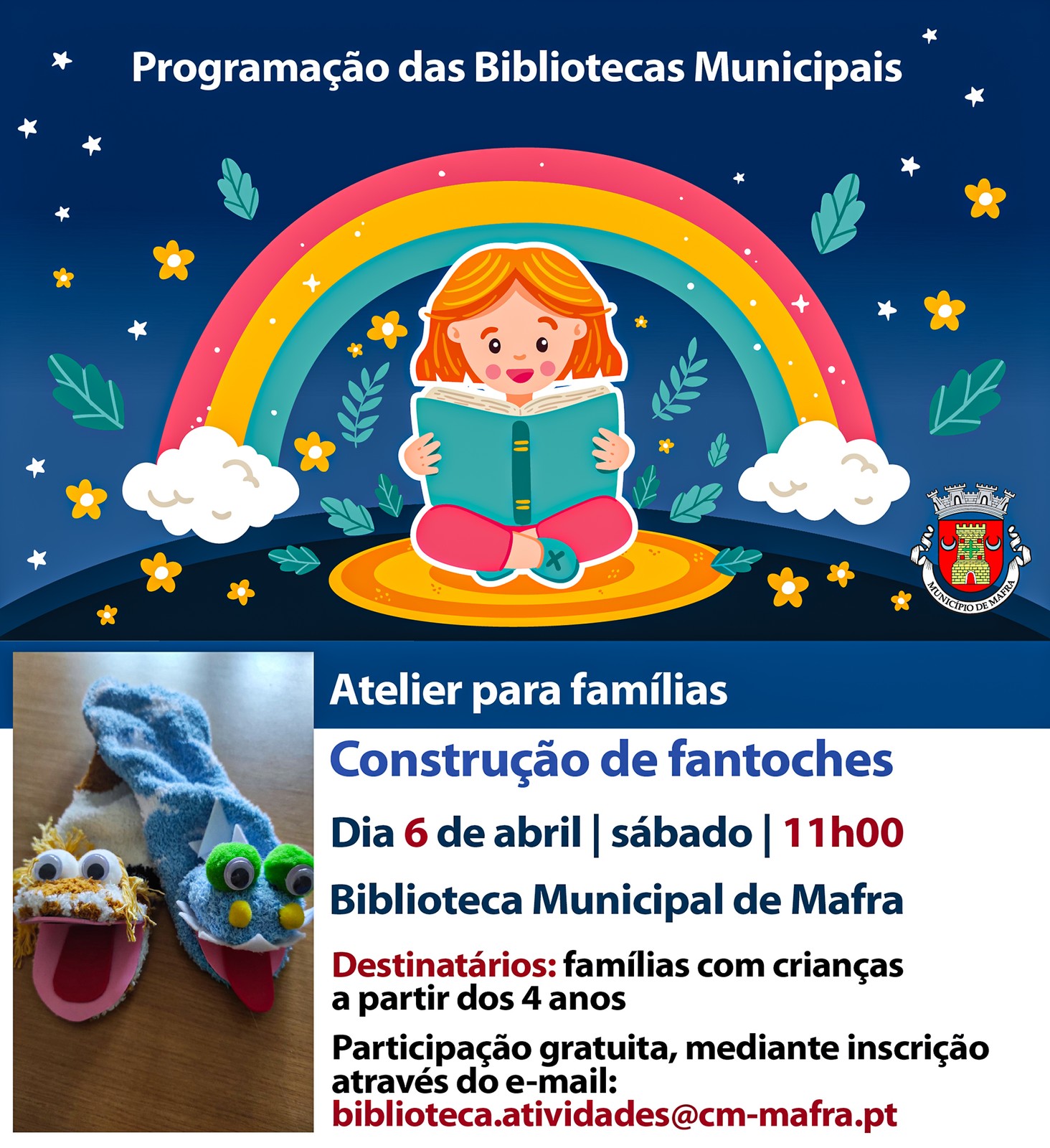 No dia 6 de abril, às 11h00, venha dar asas à imaginação e participe no atelier de construção de fantoches, na Biblioteca Municipal de Mafra. Esta atividade, destinada a famílias com crianças a partir dos 4 anos, pretende estimular a criatividade e a imaginação dos mais pequenos, através da construção de fantoches simples e respetiva manipulação.