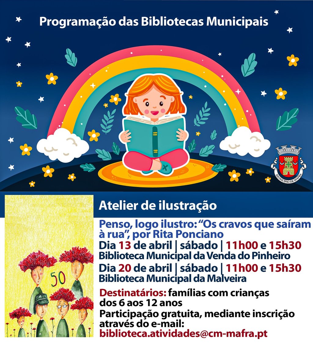 “Penso, logo ilustro” é o novo atelier de ilustração, dinamizado pela artista Rita Ponciano, que pretende incentivar à imaginação dos mais pequenos. Sob o tema “Os cravos que saíram à rua”, a atividade realiza-se às 11h00 e às 15h30 dos dias 13 e 20 de abril, na Biblioteca Municipal da Venda do Pinheiro e na Biblioteca Municipal da Malveira, respetivamente.