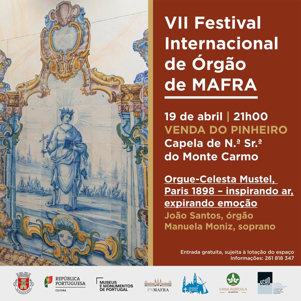 A Capela de N.ª Sr.ª do Monte Carmo, na Venda do Pinheiro, acolhe o próximo concerto do Festival Internacional de Órgão de Mafra. Não perca, hoje, às 21h00, o concerto “Orgue-Celesta Mustel, Paris 1898 – inspirando ar, expirando emoção”, pelo organista João Santos, acompanhado da soprano Manuela Moniz.