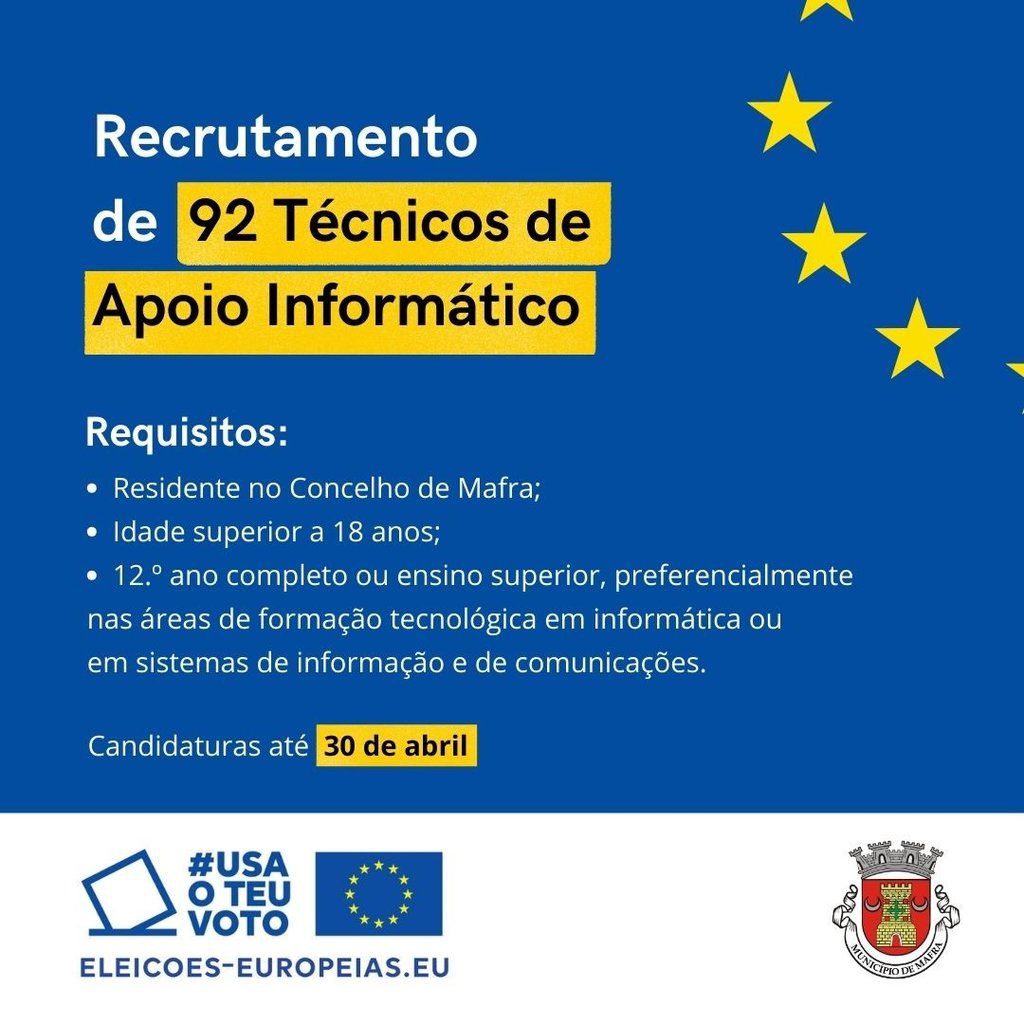 Até ao dia 30 de abril, está a decorrer o processo de recrutamento de 92 Técnicos de Apoio Informático (TAI) para acompanhar e prestar apoio técnico em cada uma das assembleias e secções de voto no Município de Mafra, no âmbito das Eleições para o Parlamento Europeu. Pela primeira vez, serão utilizados cadernos eleitorais digitais, que estarão disponíveis em equipamentos informáticos exclusivos para o efeito.