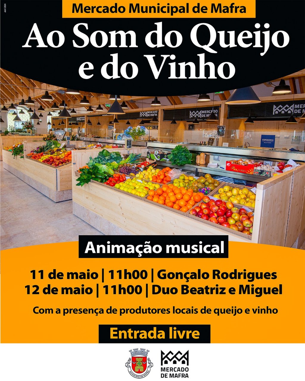 A animação no Mercado Municipal de Mafra continua! Não perca, no próximo fim de semana, dias 11 e 12 de maio, o programa de atividades "Ao Som do Queijo e do Vinho", com a presença de produtores locais. Às 11h00, assista às apresentações musicais de Gonçalo Rodrigues (sábado, dia 11) e do Duo Beatriz e Miguel (domingo, dia 12). Entrada livre.