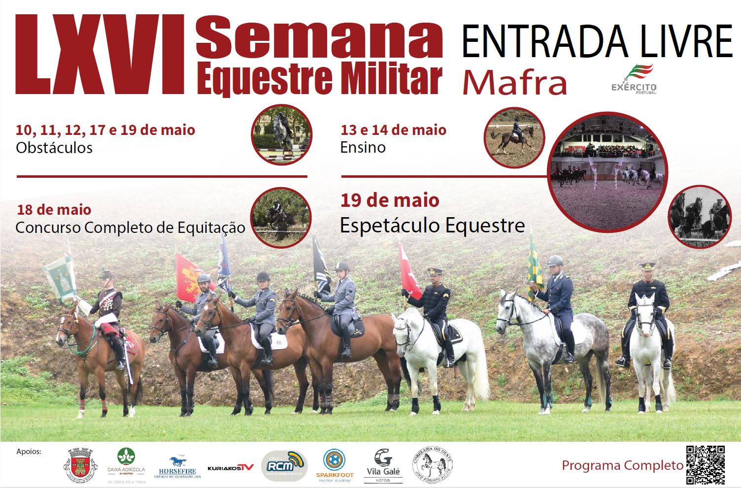 De 10 a 19 de maio, a Escola das Armas, em Mafra, promove a LXVI Semana Equestre Militar, o acontecimento desportivo castrense de maior tradição. O programa integra provas de obstáculos e de ensino, um concurso completo de equitação, para além de um espetáculo equestre. A entrada é livre.