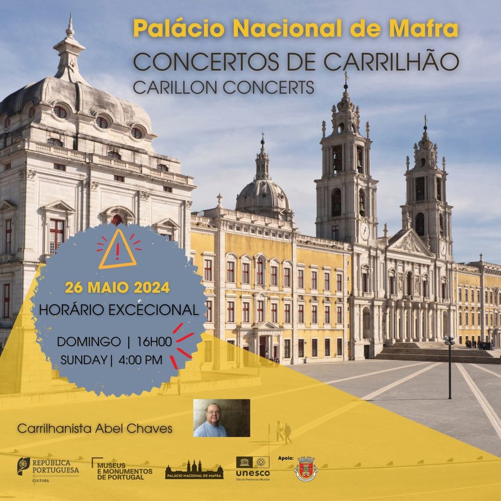 Realiza-se no domingo, dia 26 de maio, excecionalmente pelas 16h00, um concerto de carrilhão. O público pode ouvir, no Claustro Sul do Real Edifício de Mafra, alguns sucessos da música popular, intercalados com grandes clássicos da música portuguesa e internacional, interpretados pelo carrilhanista Abel Chaves.