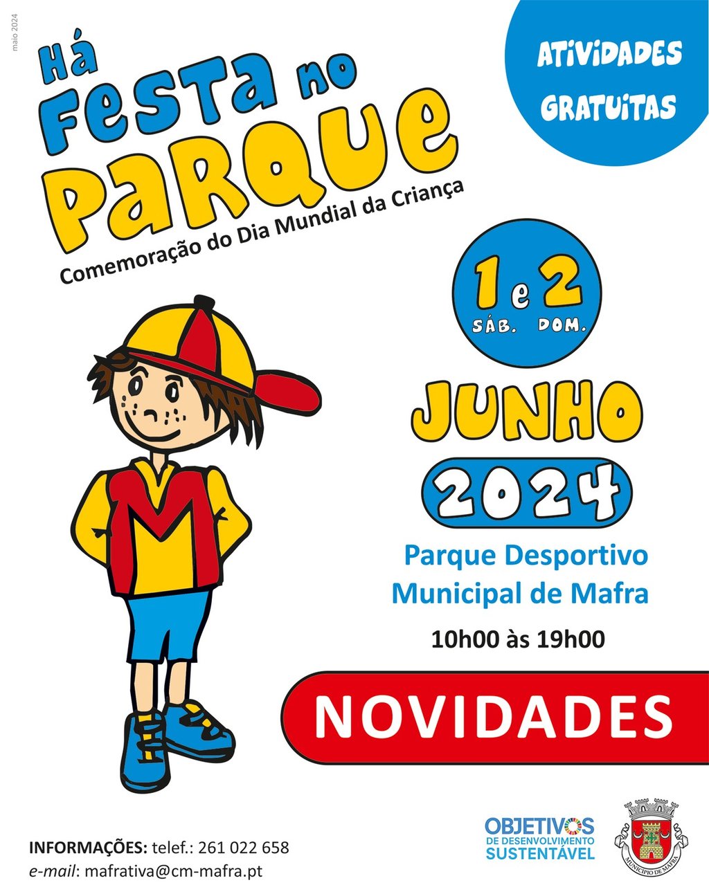 Durante dois dias, o Dia Mundial da Criança é assinalado no Parque Desportivo Municipal de Mafra. Nos dias 1 e 2 de junho, entre as 10h00 e as 19h00, são muitas as diversões e animação dedicada aos mais novos e famílias. Conheça as principais novidades: Espaço bebé, Espaço juventude, Circo e Mega Water Slide.