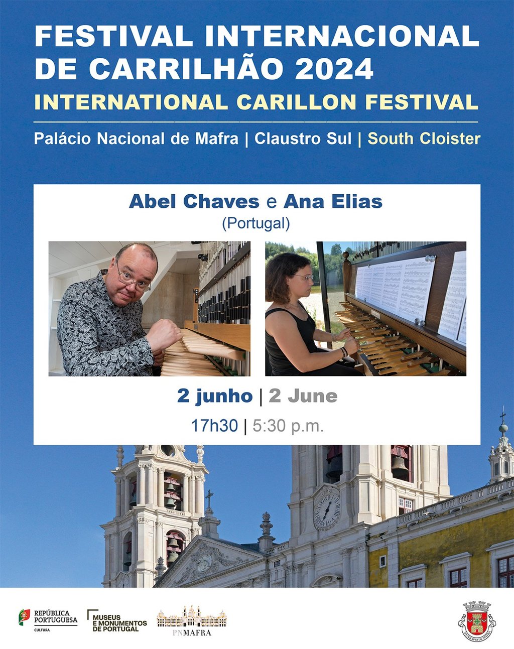 Os carrilhanistas portugueses Abel Chaves e Ana Elias são os protagonistas do concerto a quatro mãos do Festival Internacional de Carrilhão, que se realiza no domingo, dia 2 de junho, às 17h30. O público pode assistir, gratuitamente, no Claustro Sul do Palácio Nacional de Mafra.