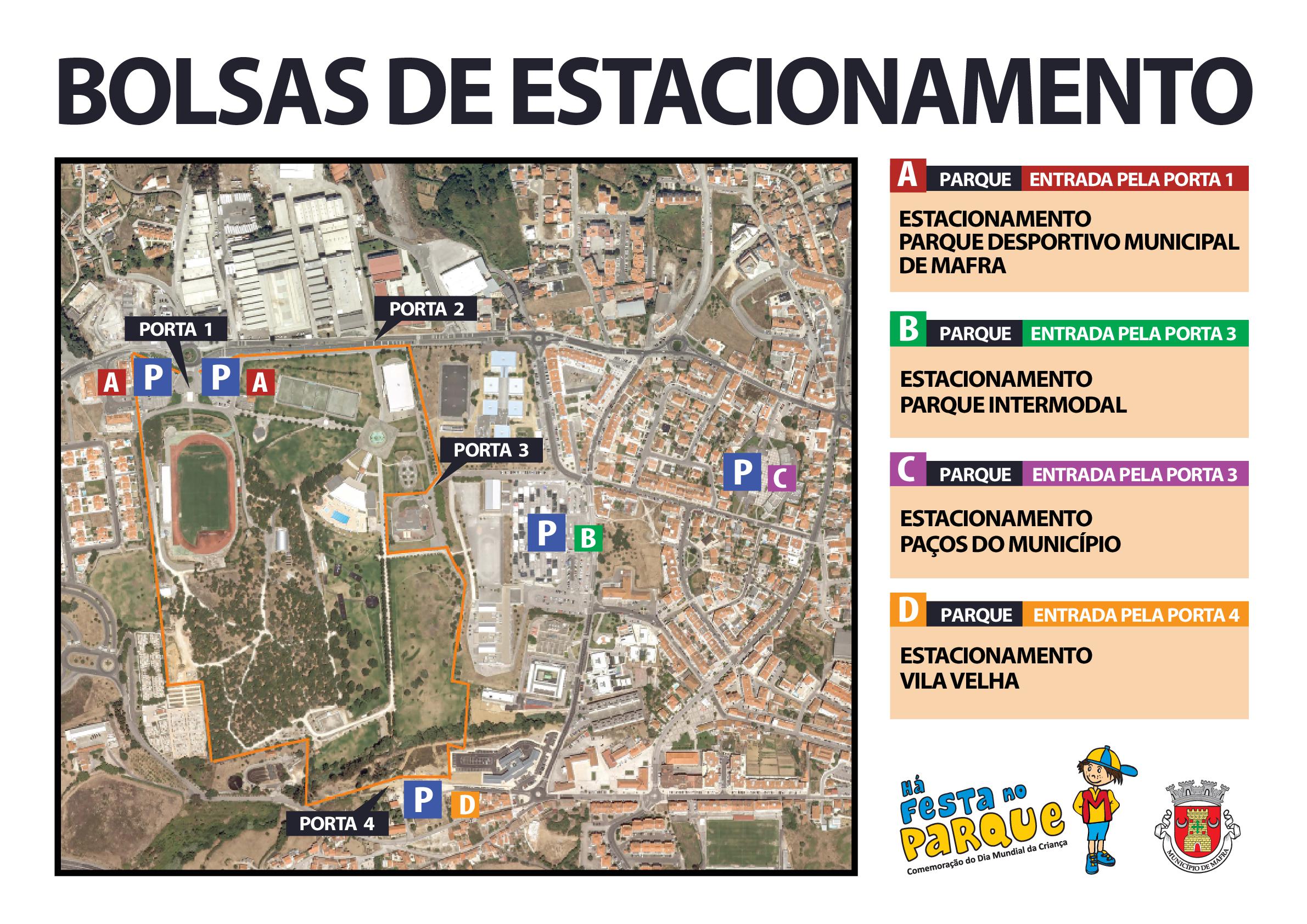 Nos dias 1 e 2 de junho, traga as suas crianças ao evento “Há Festa no Parque”. Não sabe onde deixar o carro? O Parque Desportivo Municipal de Mafra dispõe de quatro entradas, com diferentes opções de estacionamento automóvel na envolvente. No mapa, estão assinaladas as alternativas ao seu dispor.