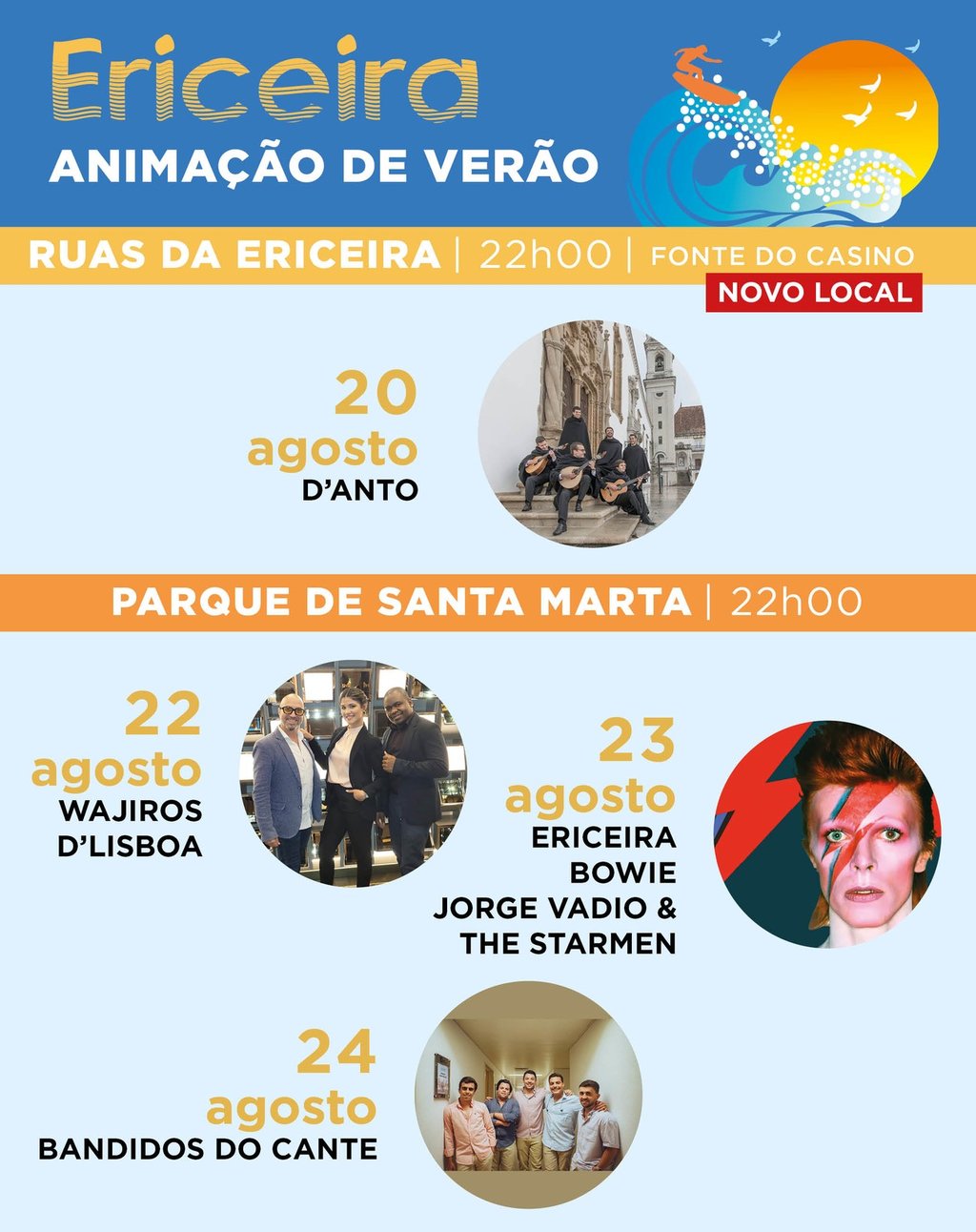 - Ericeira Bowie – Jorge Vadio & The Starmen (sexta-feira, 23 de agosto, às 22h00, no Parque de Santa Marta);