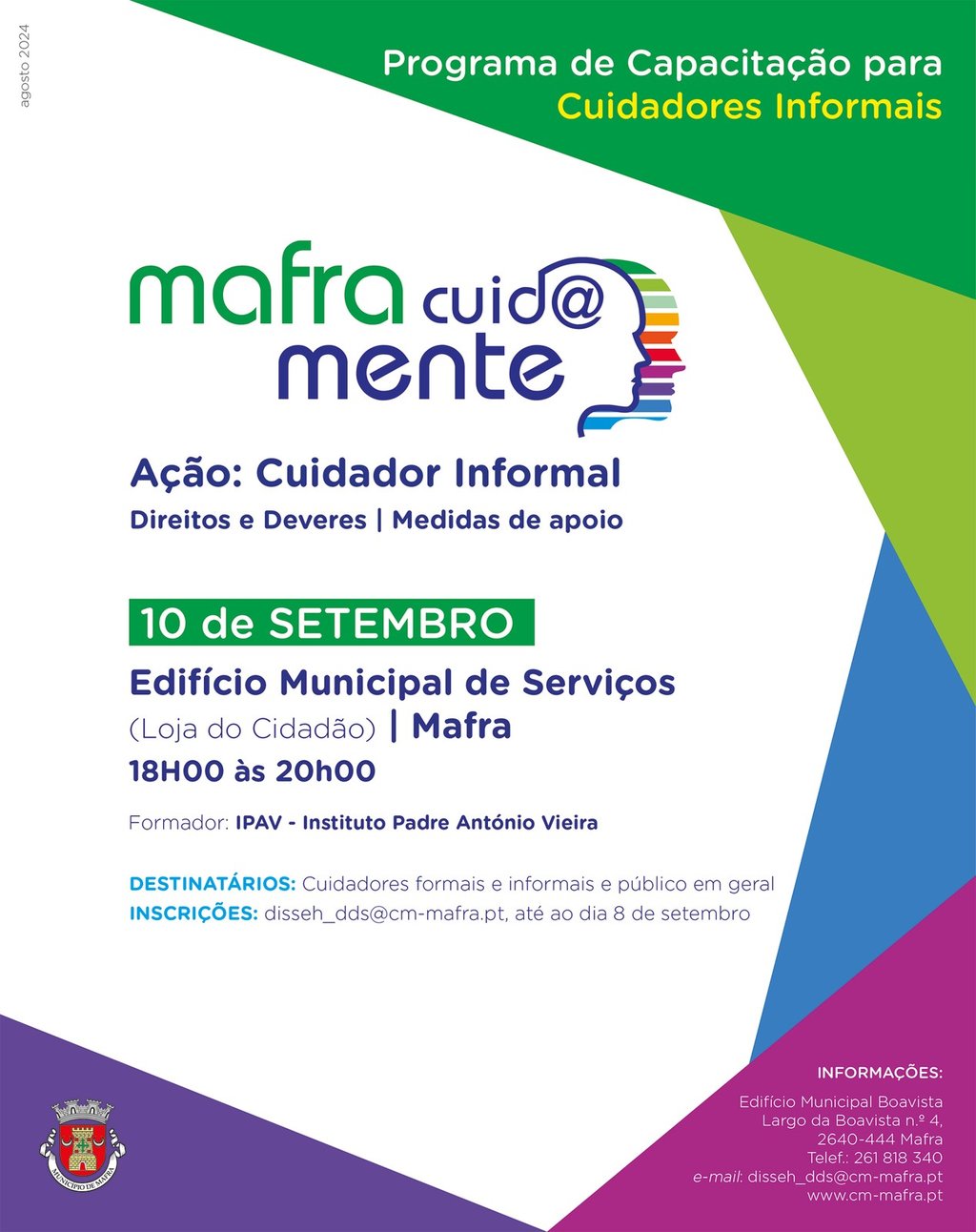 No âmbito do projeto “Cuid@Mente: Cuidar partilhando”, a Câmara Municipal de Mafra promove um programa de ações de formação e capacitação, destinado a cuidadores formais e informais e todos os potenciais interessados. A primeira sessão está agendada para o dia 10 de setembro, às 18h00, no Salão Nobre do Edifício Municipal de Serviços (Loja do Cidadão) de Mafra.