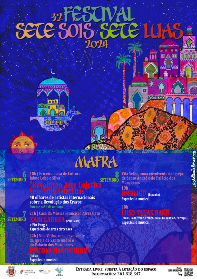 De 6 a 8 de setembro, o Festival Sete Sóis Sete Luas traz a arte e a música popular contemporânea à Casa da Música Francisco Alves Gato e à Vila Velha, junto à Igreja de Santo André e ao Palácio dos Marqueses, em Mafra.