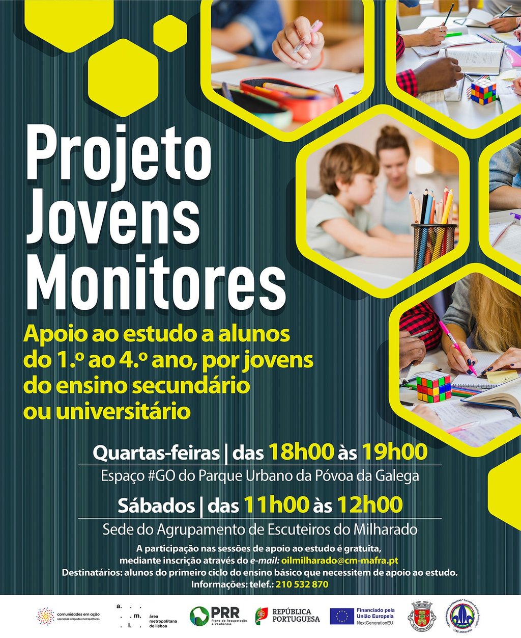 O Município de Mafra, em colaboração com o Agrupamento de Escuteiros do Milharado, promove o Projeto Jovens Monitores, que tem como objetivo dinamizar espaços de apoio ao estudo nos quais jovens estudantes do ensino secundário e superior prestem apoio a crianças do ensino básico na realização de trabalhos de casa e criação de métodos de estudo. Irão estar em funcionamento dois espaços de apoio ao estudo: Espaço #GO do Parque Urbano da Póvoa da Galega e Sede do Agrupamento de Escuteiros do Milharado.