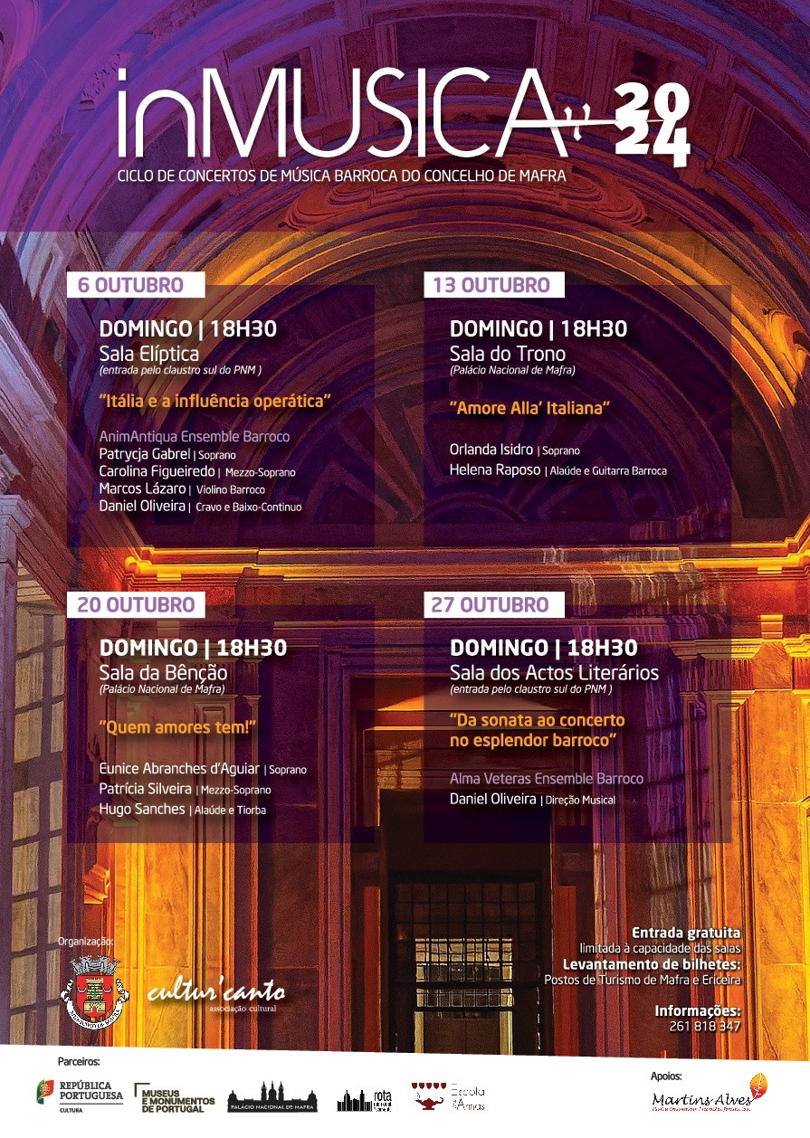 O inMusica – Ciclo de Música Barroca do Concelho de Mafra está quase a começar! De 6 a 27 de outubro, estão agendados quatro concertos, em algumas das mais emblemáticas salas do Real Edifício de Mafra. O concerto de abertura realiza-se no dia 6, pelas 18h30, na Sala Elíptica (entrada pelo claustro sul do Palácio Nacional de Mafra).