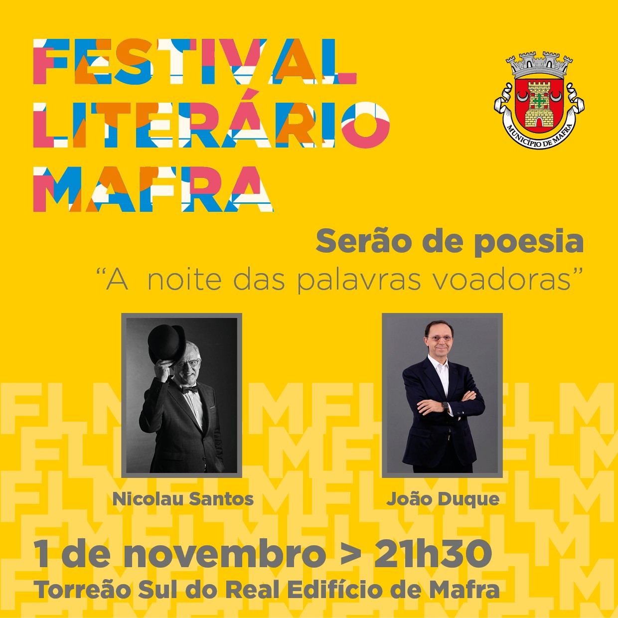 “A noite das palavras voadoras” é o mote para o serão de poesia, uma das novidades da 2.ª edição do Festival Literário de Mafra. Com a presença de Nicolau Santos e João Duque, a sessão decorre no dia 1 de novembro, pelas 21h30, no Torreão Sul do Real Edifício de Mafra.