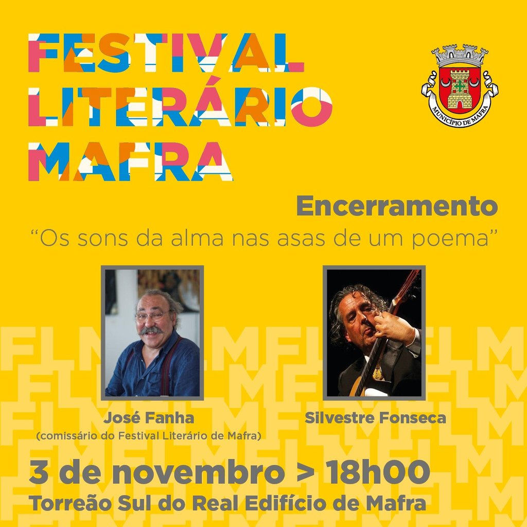 “Os sons da alma nas asas de um poema” marca o encerramento da 2.ª edição do Festival Literário de Mafra, onde estarão presentes o músico Silvestre Fonseca e o poeta José Fanha, comissário do Festival. A sessão está marcada para o dia 3 de novembro, às 18h00, no Torreão Sul do Real Edifício de Mafra.