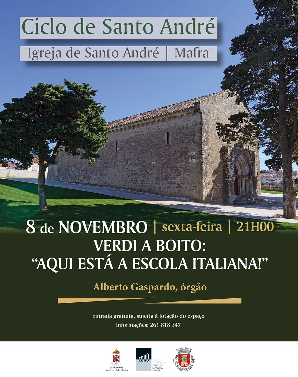 A Igreja de Santo André, em Mafra, acolhe mais um concerto de órgão, no âmbito do Ciclo de Música de Santo André. O espetáculo realiza-se no próximo dia 8 de novembro, às 21h00, sendo protagonizado pelo organista Alberto Gaspardo.