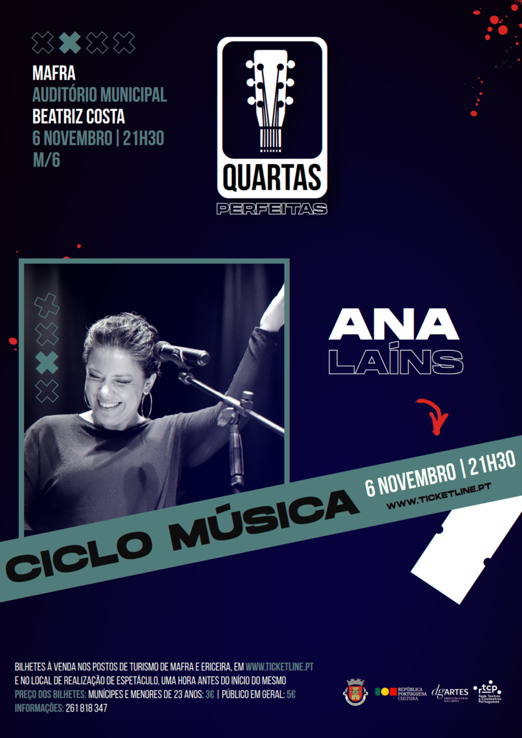 Mais de 25 anos de carreira, passados em palcos de 30 países. Ana Laíns é a protagonista do próximo concerto do Ciclo de Música “Quartas Perfeitas”. O espetáculo está marcado para o dia 6 de novembro, às 21h30, no Auditório Municipal Beatriz Costa, em Mafra.