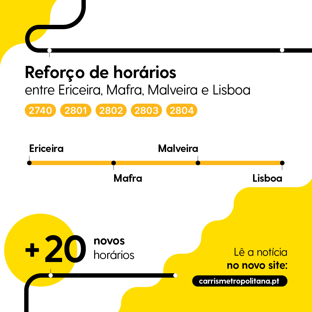 A partir do dia 2 de dezembro, a Carris Metropolitana disponibiliza 20 novos horários nas ligações entre Mafra, Ericeira, Malveira, Venda do Pinheiro e Lisboa.
