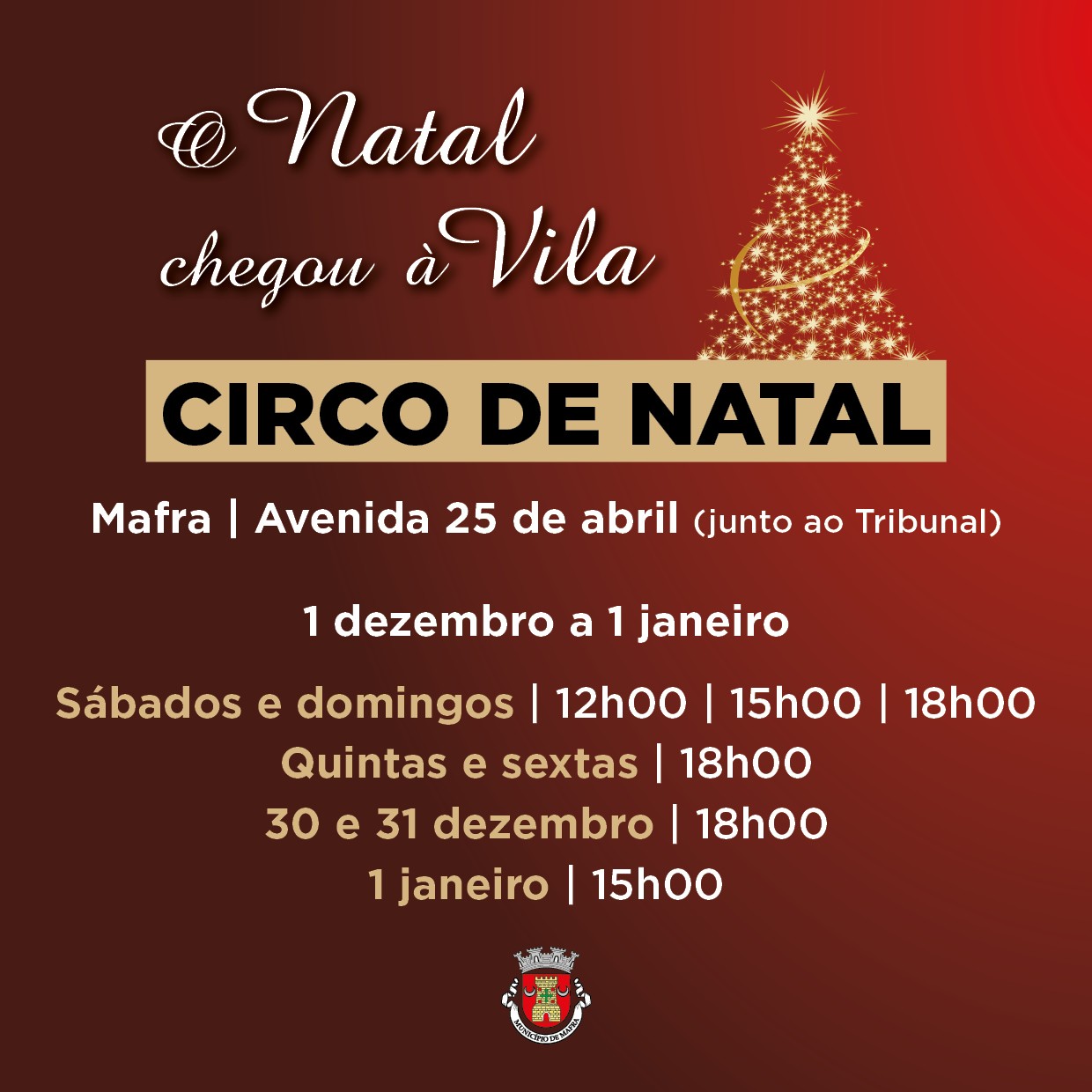 Até ao dia 1 de janeiro, o Circo de Natal estará em Mafra para animar os mais pequenos. Instalado na Avenida 25 de Abril (junto ao Tribunal de Mafra), as sessões realizam-se nos seguintes dias e horários: sábados e domingos (12h00, 15h00 e 18h00); quintas e sextas (18h00); 30 e 31 de dezembro (18h00); 1 de janeiro (15h00).