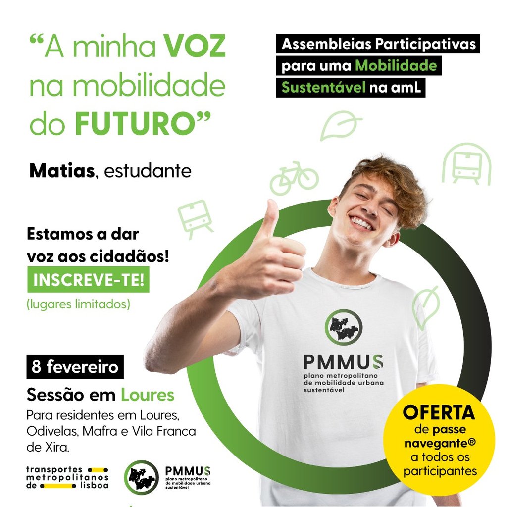 Como participar? Se tem mais de 16 anos e é residente num dos referidos concelhos, faça a sua inscrição gratuita, até ao dia 20 de janeiro, em: https://pmmus.tmlmobilidade.pt/assembleias-pmmus/ (máximo 25 participantes)