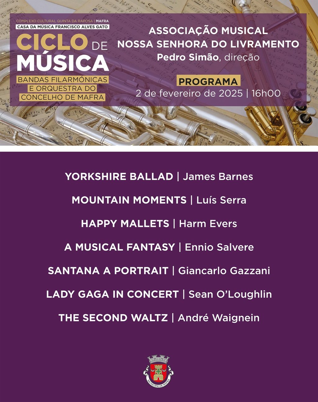 Está quase a começar o Ciclo de Música “Bandas Filarmónicas e Orquestra do Concelho de Mafra”! No dia 2 de fevereiro, às 16h00, a Associação Musical Nossa Senhora do Livramento sobe ao palco da Casa da Música Francisco Alves Gato (Mafra), para o concerto de abertura.