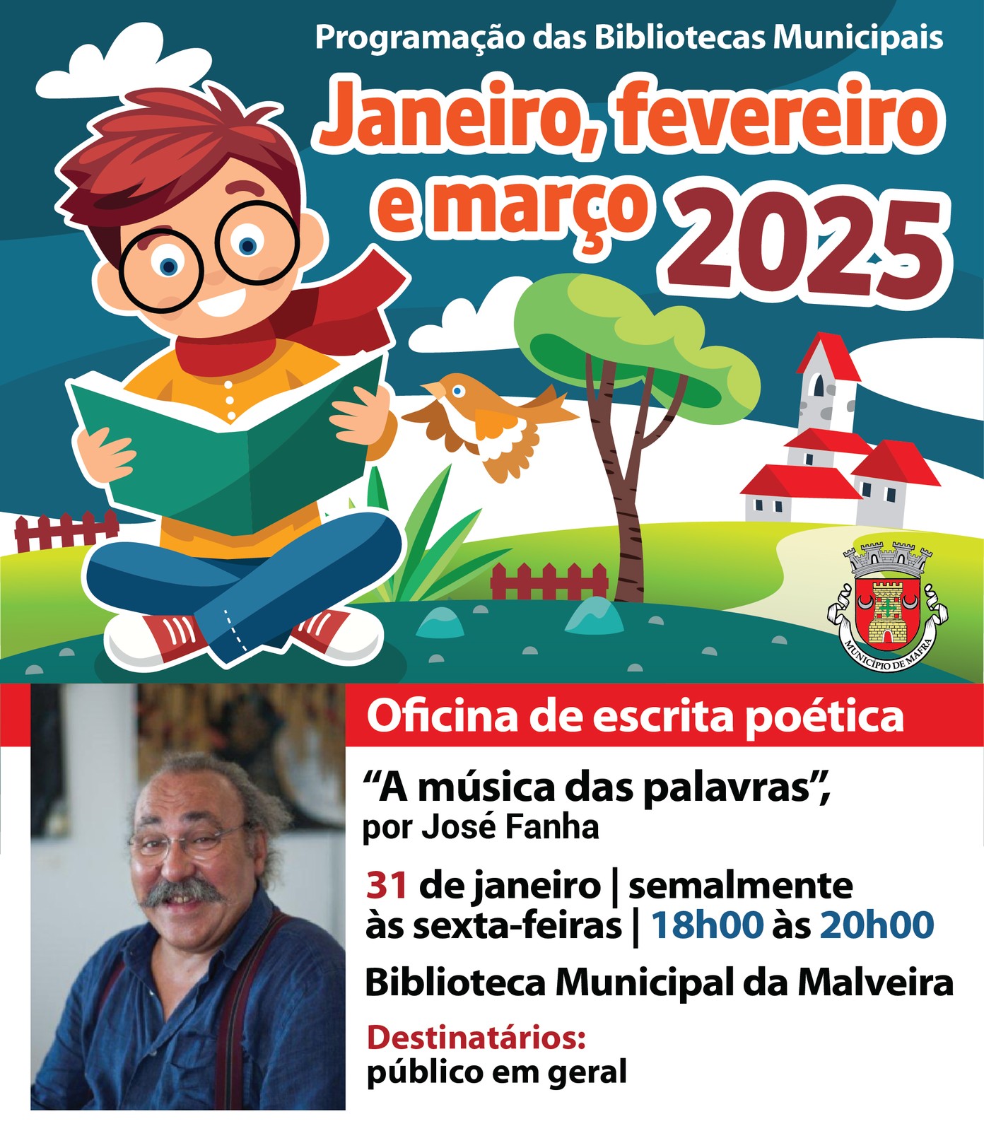 “A música das palavras” é o tema da oficina de escrita de textos poéticos, dinamizada pelo poeta José Fanha, na Biblioteca Municipal de Malveira. As sessões decorrem semanalmente, entre as 18h00 e as 20h00. A primeira oficina realiza-se já na próxima sexta-feira, dia 31 de janeiro.