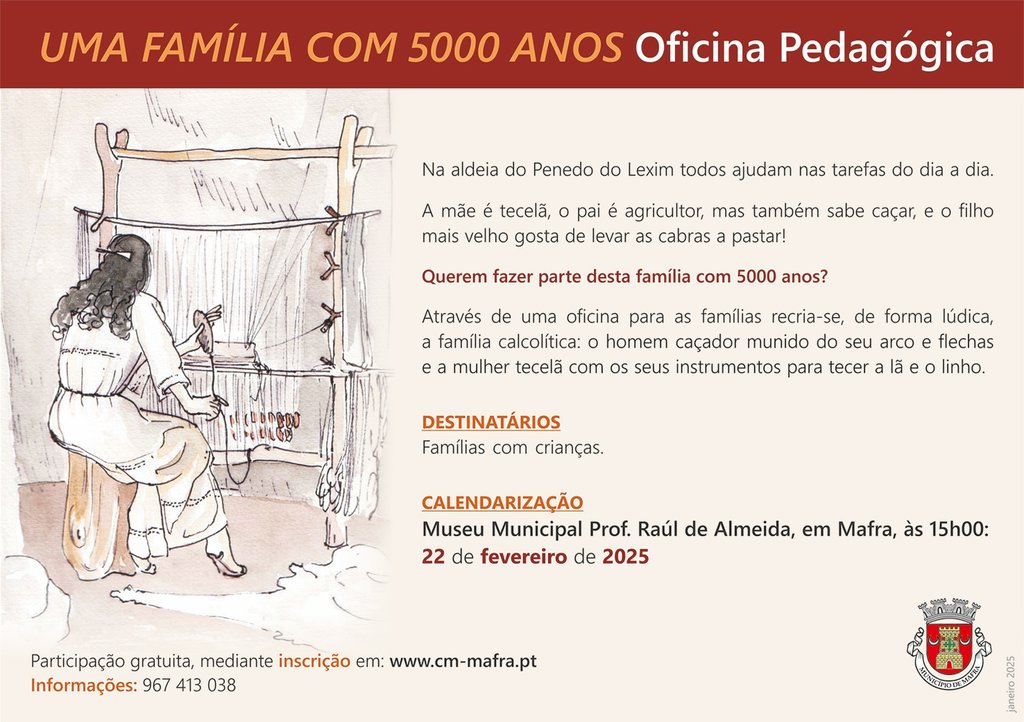Venha conhecer, de forma lúdica, “Uma família com 5000 anos”, do Período Calcolítico, através de uma oficina pedagógica. A iniciativa realiza-se no Museu Municipal Prof. Raúl de Almeida, em Mafra, no dia 22 de fevereiro, às 15h00. A participação é gratuita, mediante inscrição.